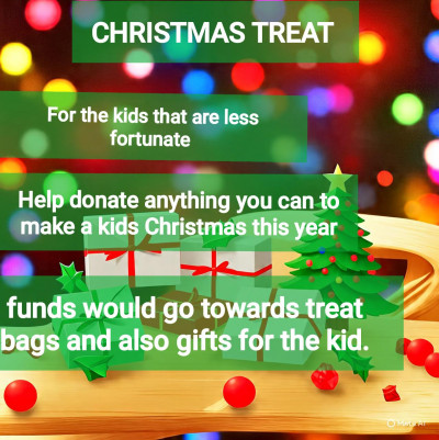 Christmas treat for the less fortunate kids to make their holidays a bit brighter. We also do hampers when we can for the families who needs it. Any little would be greatly appreciated. I have been doing treats for kids since 2022 I'm 24 years old and as of recent out of a job abroad due to health reasons. Nothing makes me happy than seeing the happy faces of children when they get a treat bag and gifts around Christmas time. I couldn't do it alone this year and I couldn't do it last year because I was working internationally. I ask for your help as little as it may be to make this happen.
